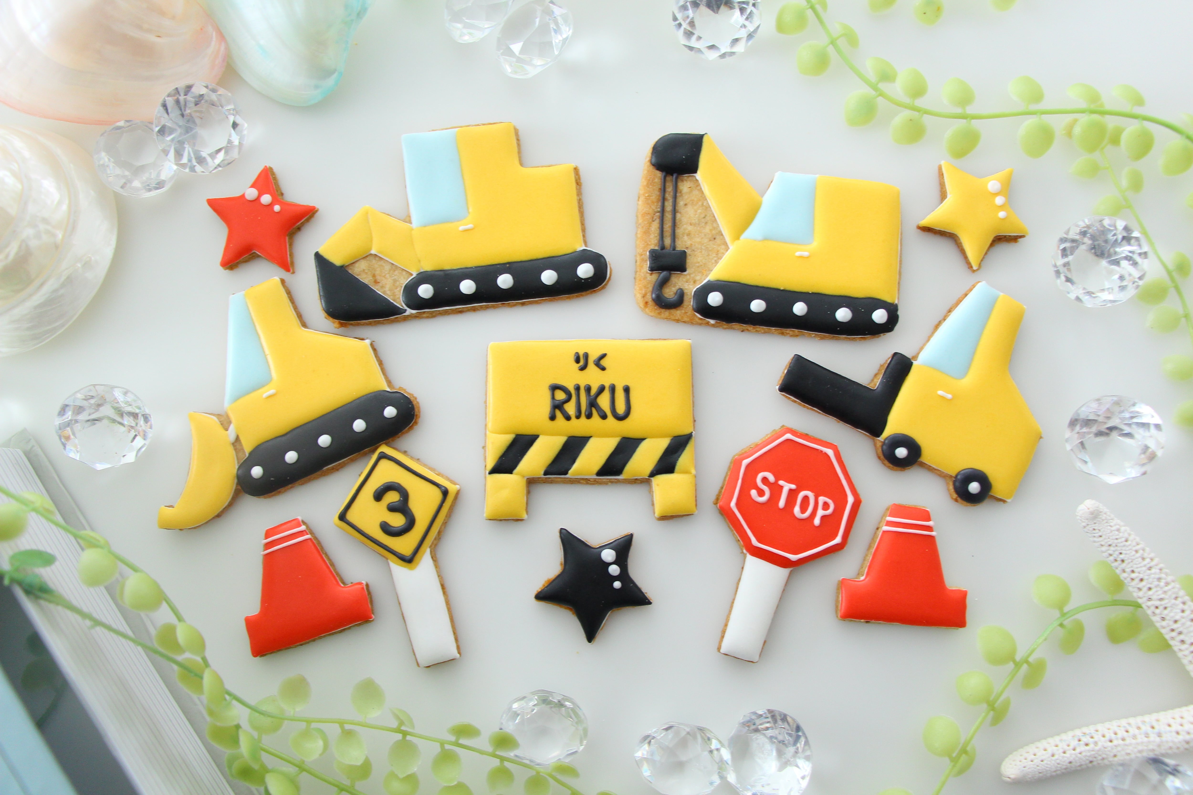 工事現場で大活躍な、クレーン車、ブルドーザー、ショベルカー、フォークリフトより3車両をお選びいただける、遊んで食べられるアイシングクッキーセットです。大切なお子様のお誕生日ケーキの飾りに、是非、いかがでしょうか?
