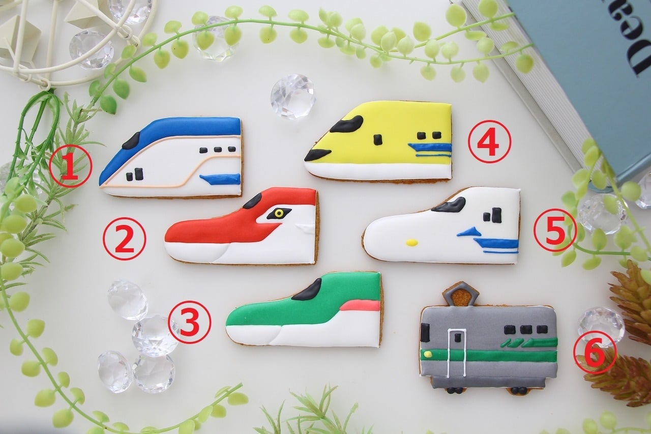 メインを5種類の新幹線と1種類の電車よりおひとつお選びいただき、看板クッキーには、お子様のお名前等(ひらがなとローマ字の両方とご年齢)を手書きいたします。