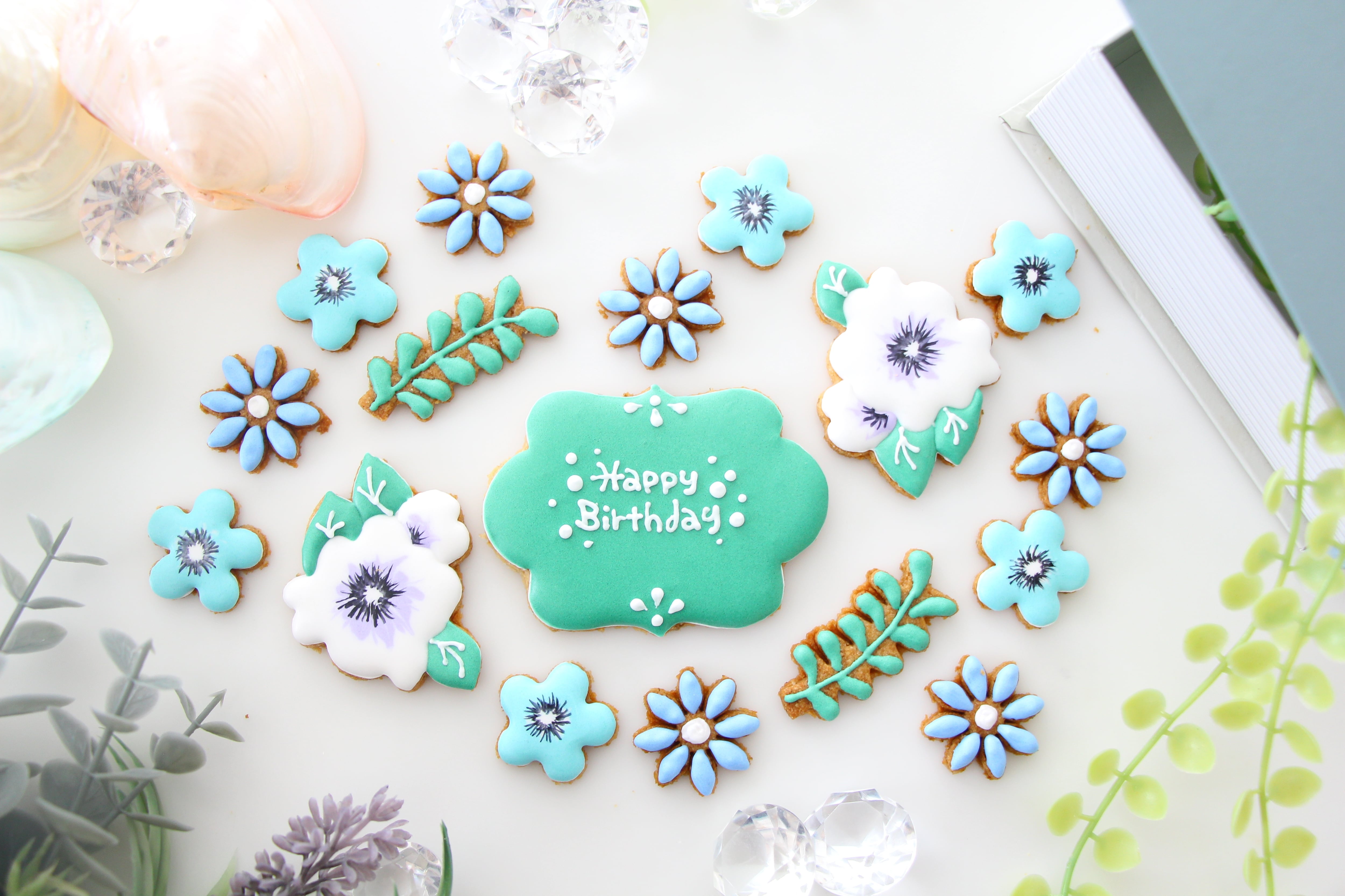 ~ブルーグリーンなシックで大人可愛いお花と植物のアイシングクッキーセット~