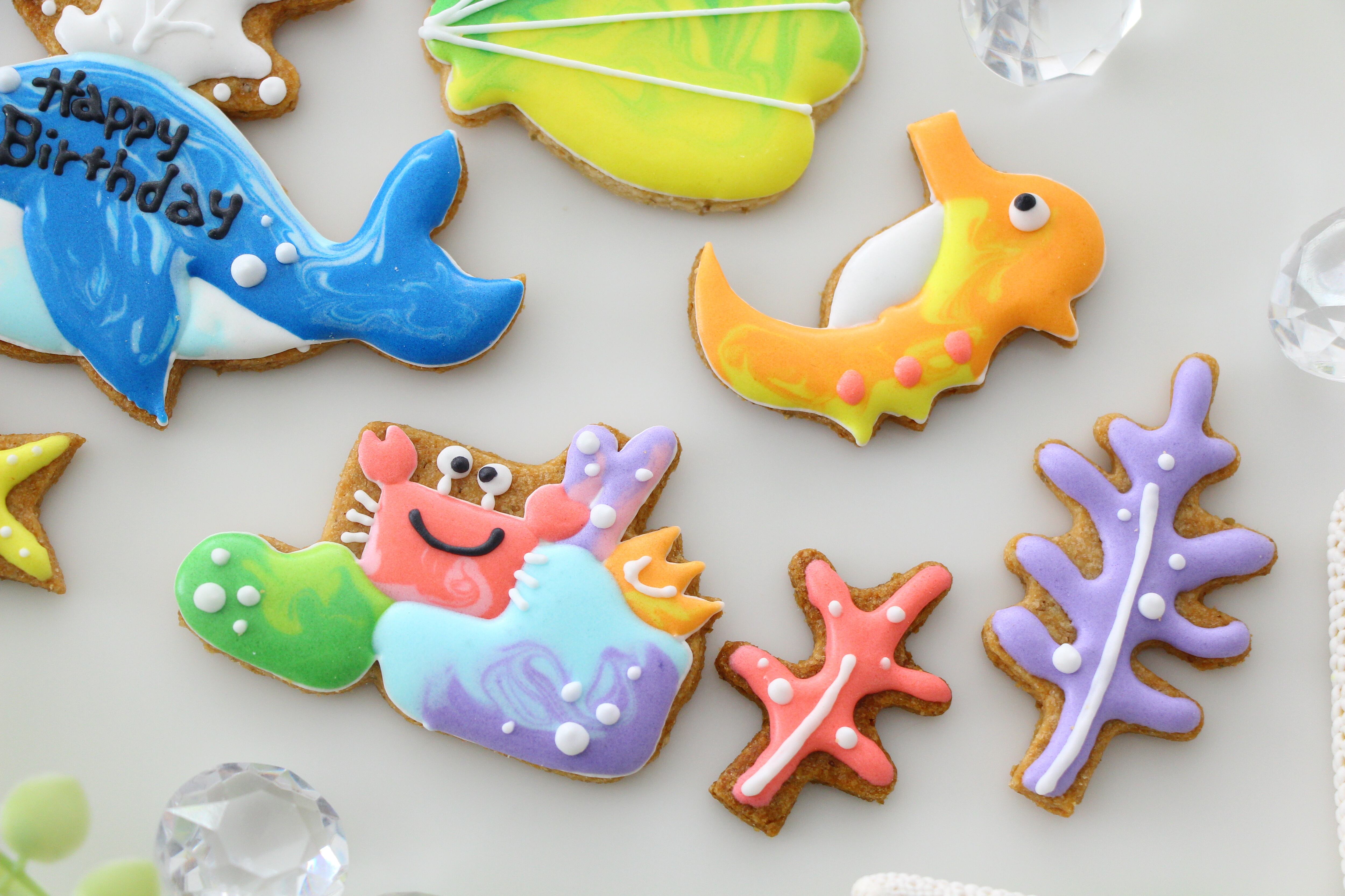 カラフルで美しいグラデーションの海の生き物たちに囲まれ、楽しいお誕生日ケーキに飾ることのできるアイシングクッキーセットです。水彩画調の、美しいグラデーションをイメージしました。海や水族館が大好きなお子様にぜひ、いかがでしょうか。