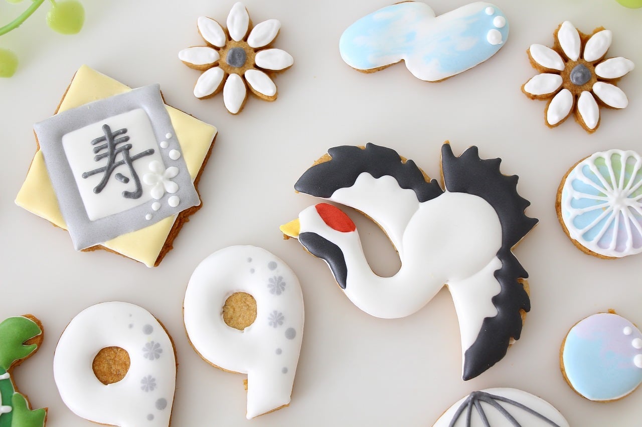 日本らしい、和柄と縁起物(鶴、亀、鯛)、白のちゃんちゃんこのアイシングクッキーセットです。一生に一度しかない99歳の白寿のお祝い記念に、いかがでしょうか。