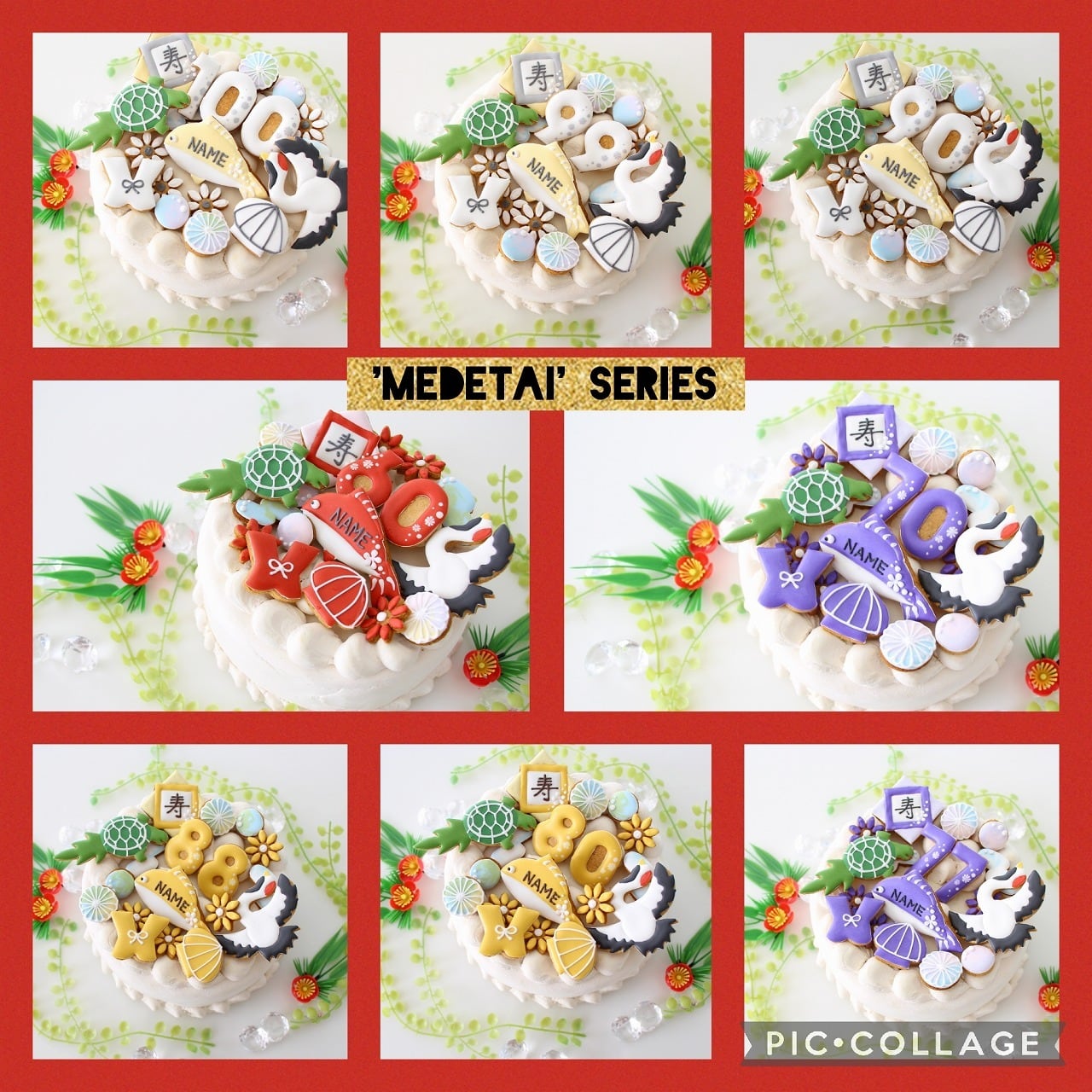 日本らしい、和柄と縁起物(鶴、亀、鯛)、白のちゃんちゃんこのアイシングクッキーセットです。100歳を迎えられる方のスペシャルな百寿のお祝い記念に、いかがでしょうか。